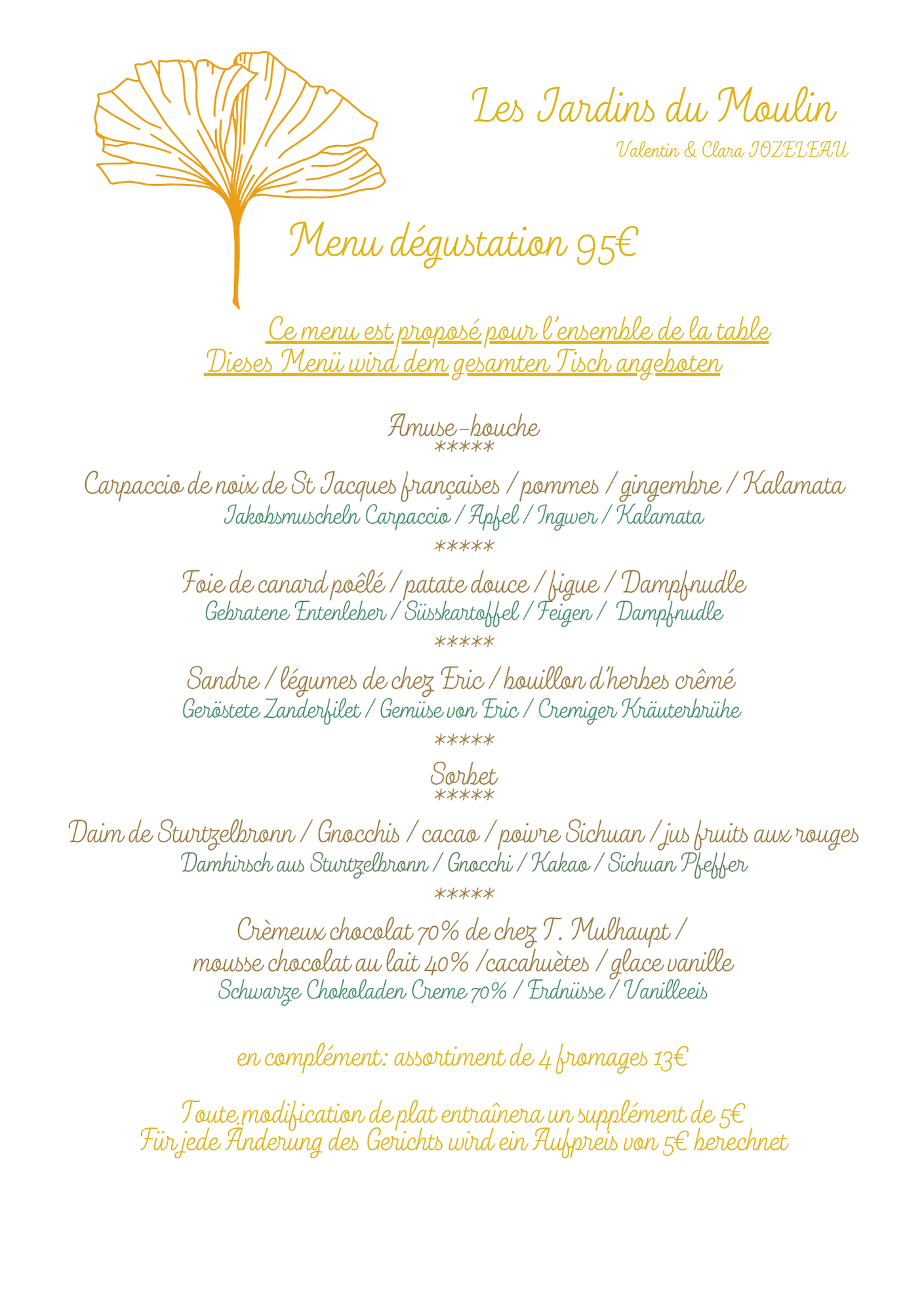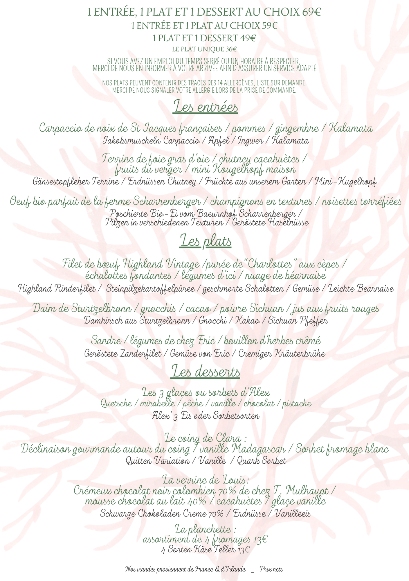 Prix nets.Pour votre information, la carte est mise à jour régulièrement, toutefois, il est possible que certains plats proposés le jour de votre réservation diffèrent de la carte en ligne, en fonction des produits de saison!